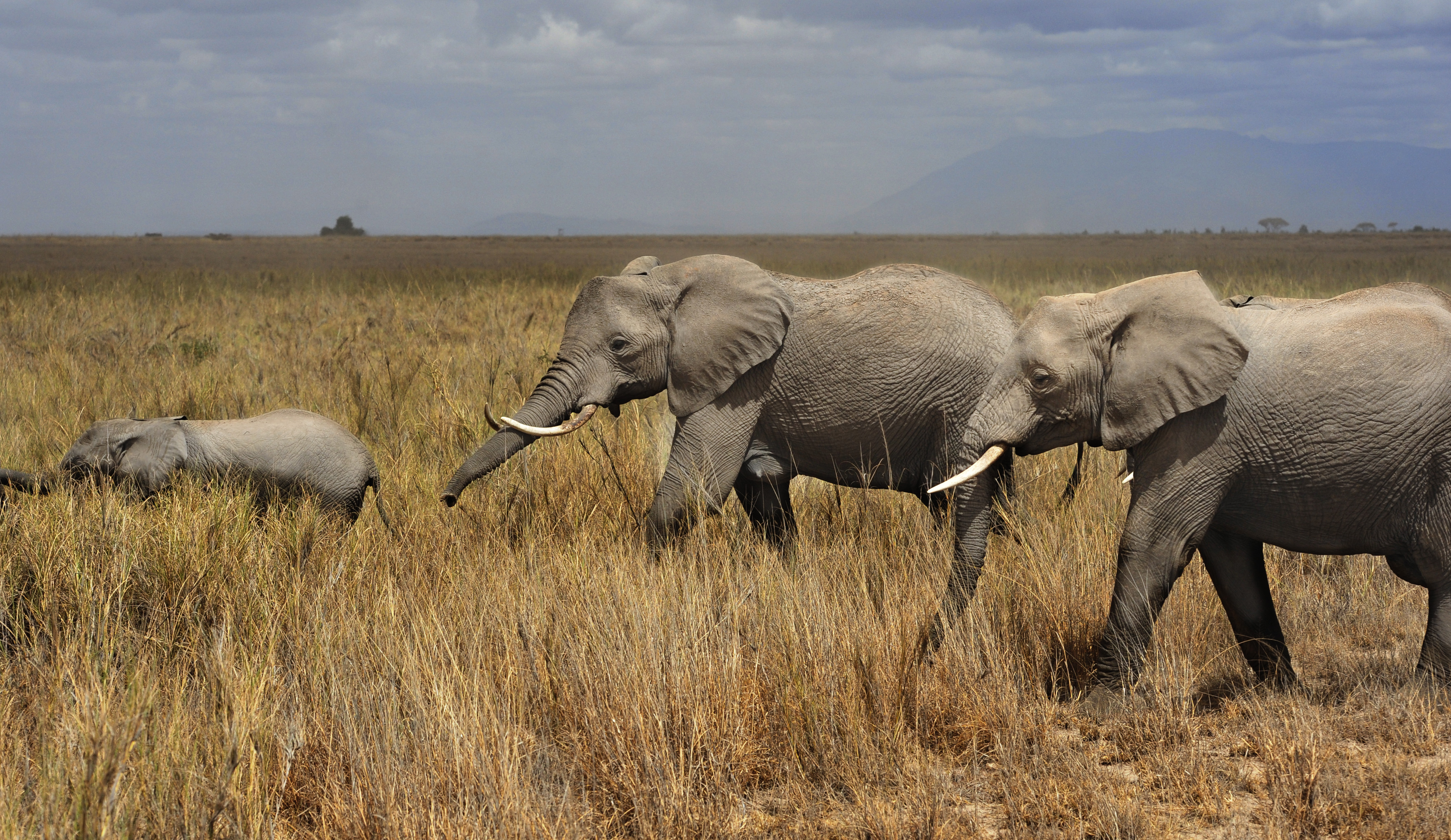 Most elephants in Amboseli spend their nights in the forests at the base of Kilimanjaro and spend their days in the swamps eating up to 300 lbs. of vegetation. Visitors to the park seek out the long lines of elephants as they make their way to and from the swampy eating and drinking sites and delight in seeing the tiny elephant calves walking among the hulking adults.