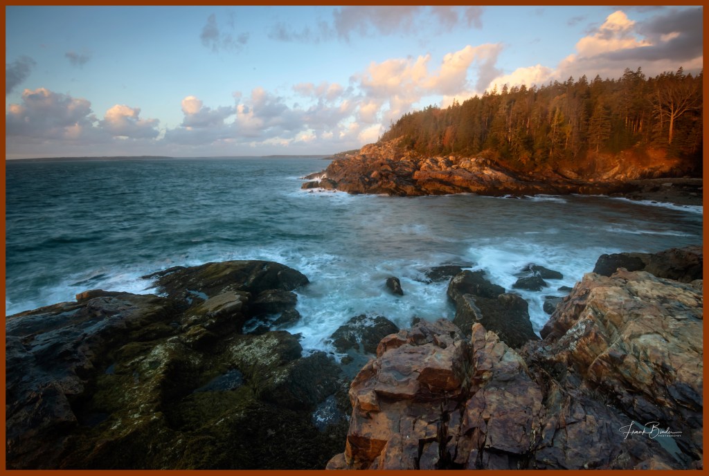 I got up each morning in the dark and went to Hunter’s Head to try and get a great sunrise view. The good sunset composition is in the opposite direction and I set my camera and tripod up to capture a golden sunrise over the little cove in that direction. But alas, each morning the hoped for sunrise glory never materialized. On the last day I turned around to go back to my car and noticed that the risen sun was lighting up the area on the other side of Hunter’s Head. This golden rust color only lasted 2 minutes and I was forunate to get this wonderful image.