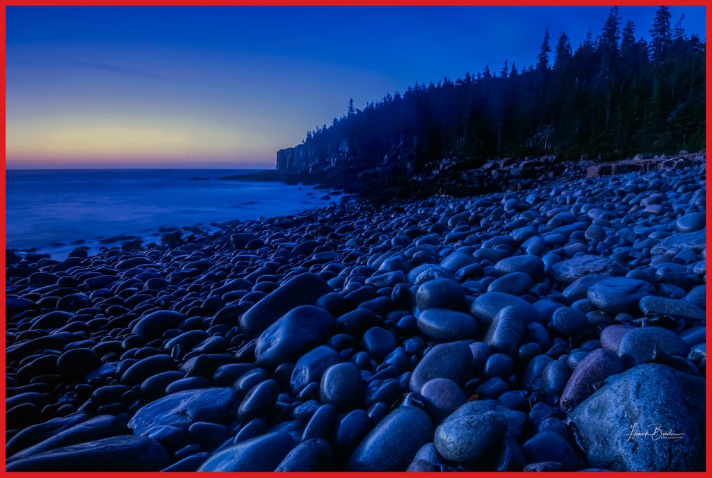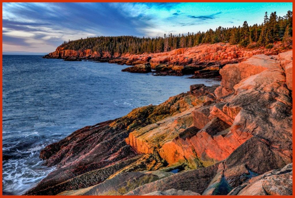This section of the park is popular with photographers because the sunrise is due east of here and the morning sun lights up the red granite that lines this coast. This color only lasts a few minutes and if you miss it, it’ll be back in 24 hours.