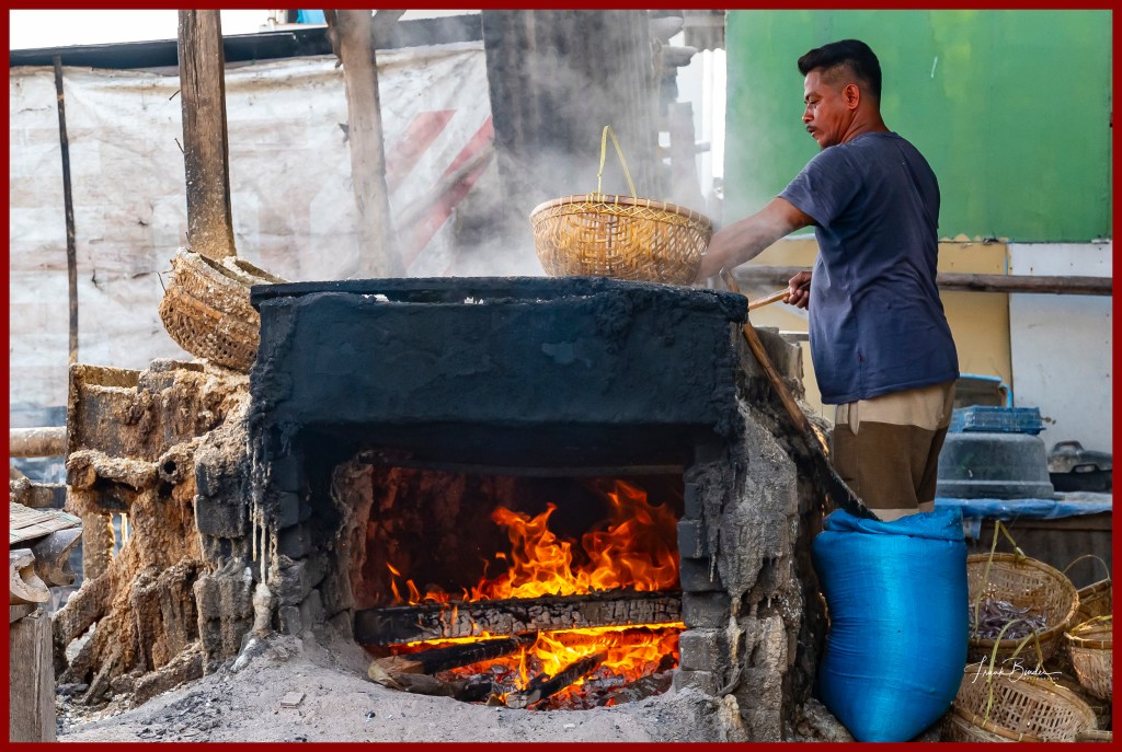 This wood-fired stove is heating a large cauldron of water. The anchovies are dumped into the water to be cooked and since they are small fish, it only takes a few minutes to finish.