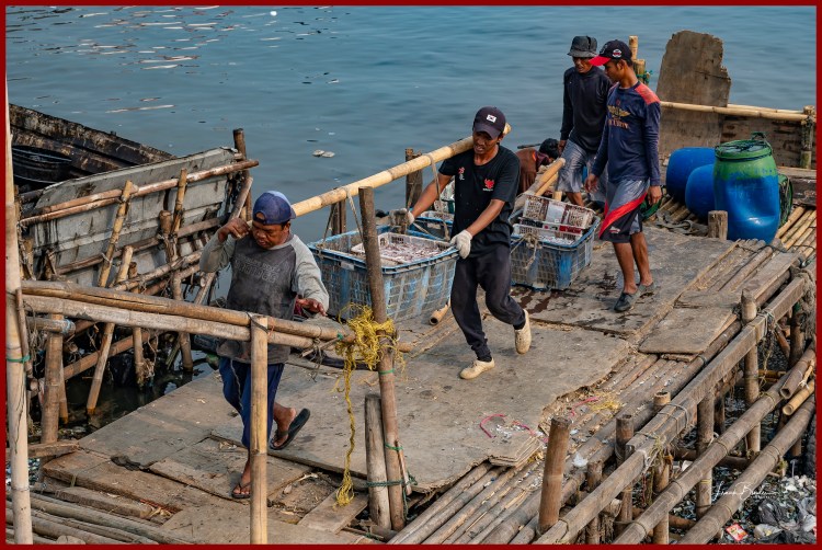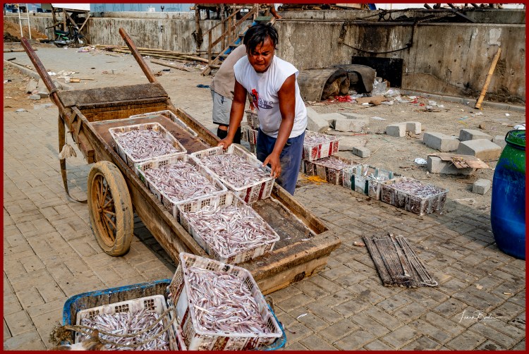These loaded carts will be carried to low-tech processing sites that are located just a few yards away on the dock.