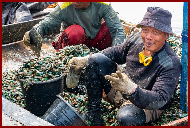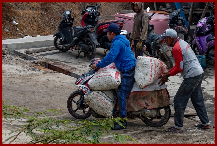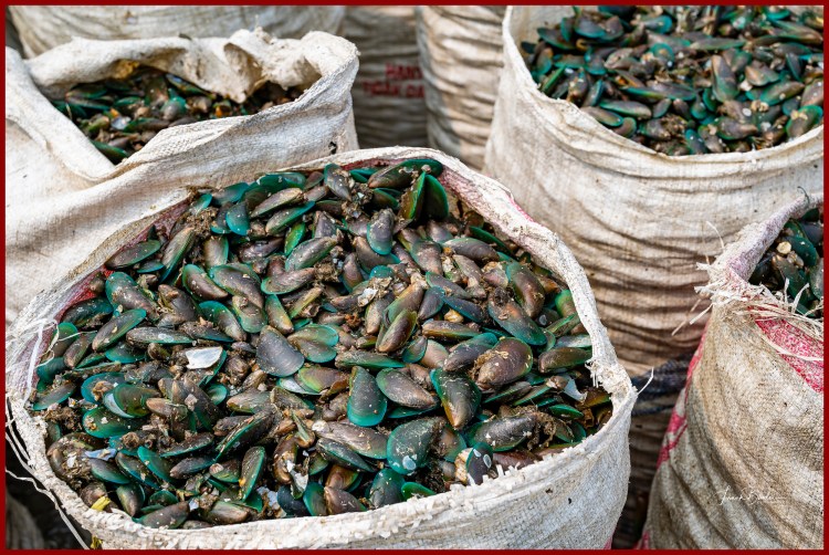 Three of these bags are loaded onto each small motor scooter for transport to buyers/restaurants. In the above case, the scooter carrying 300 lbs of mussels needs a push from someone to get it up the hill.